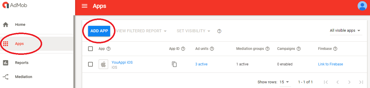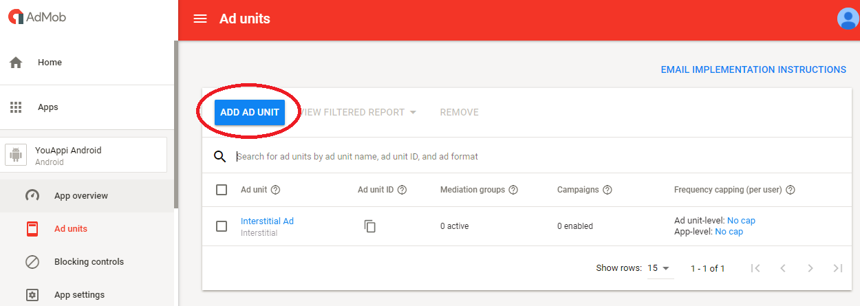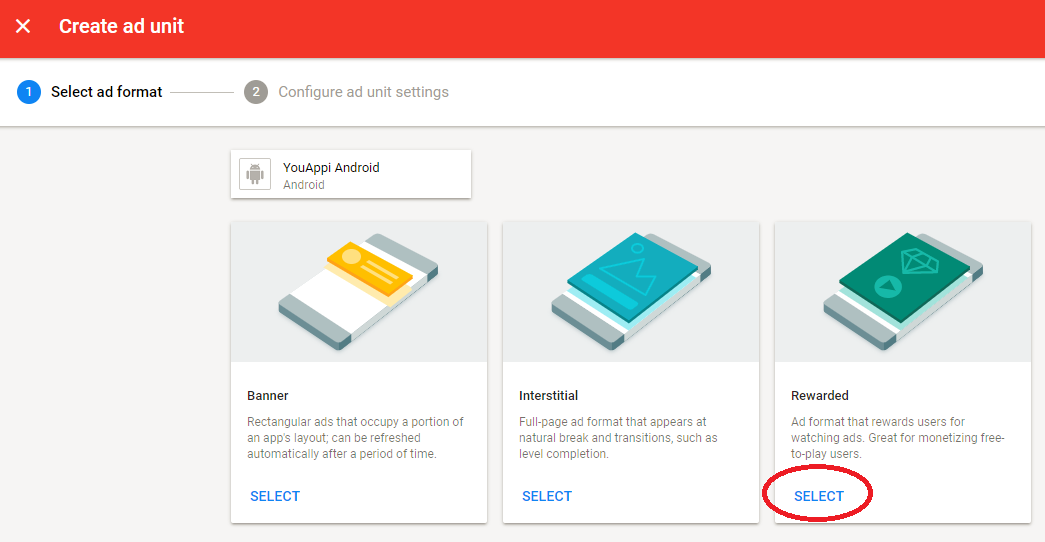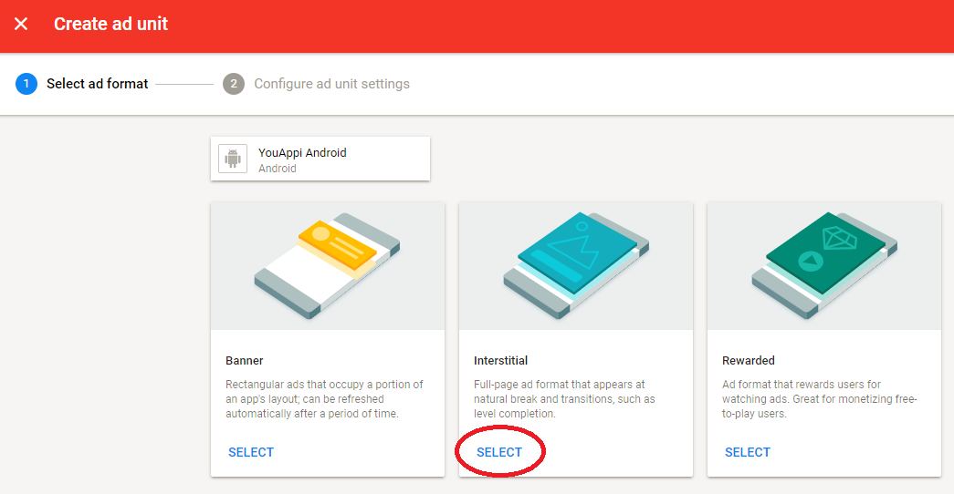 Add new ad units to your app by choosing your app and pressing ADD AD UNIT button