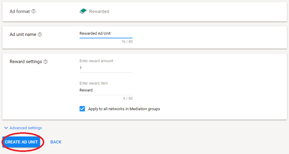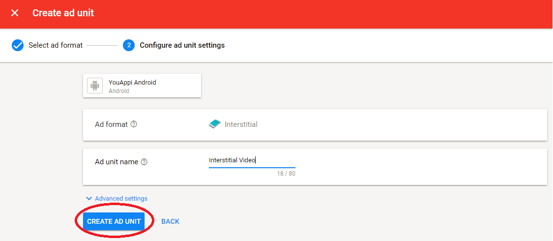 - Fill your ad unit details and press CREATE AD UNIT button: