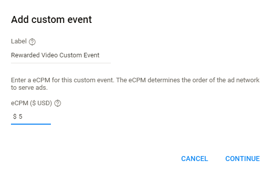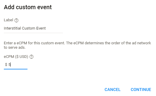 - On the popup name your custom event, fill relevant eCPM and press CONTINUE:
