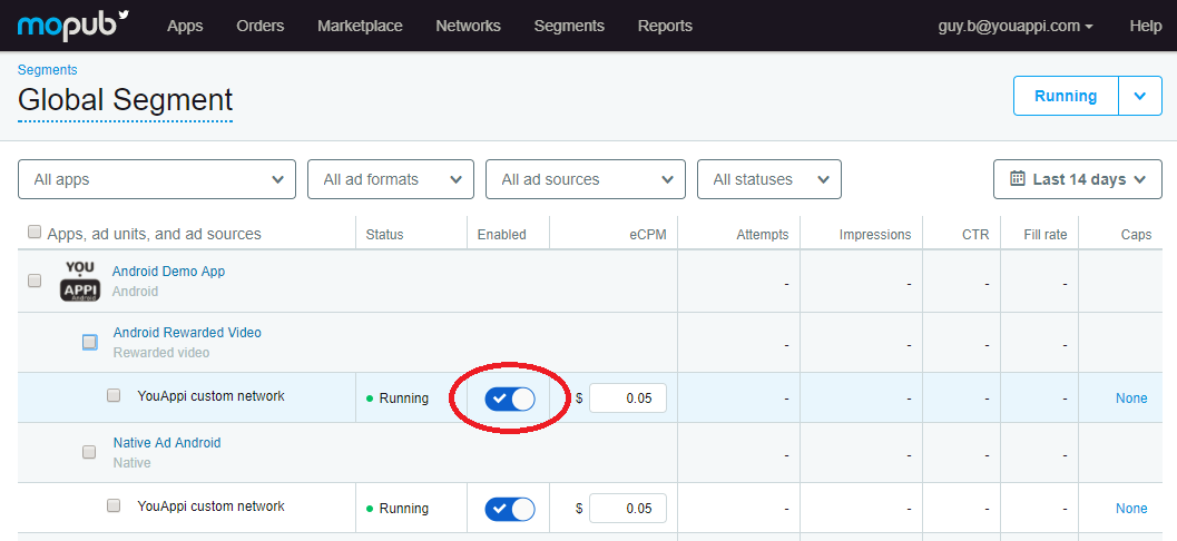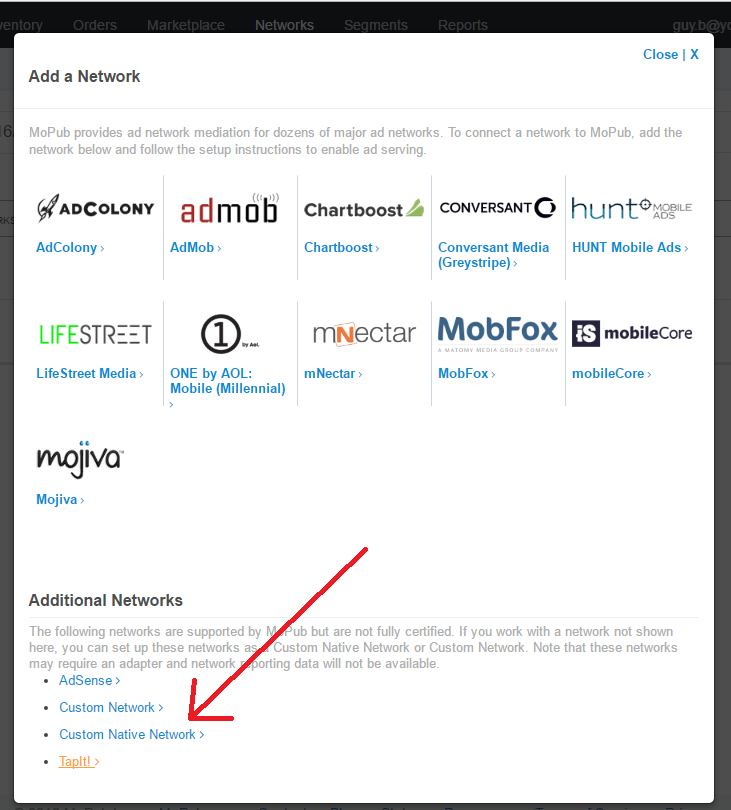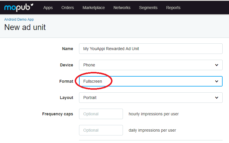- On MoPub platform on Networks tab, add a new custom network for YouAppi: